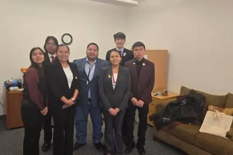 From left to right: Chapter Reporter Madison Medley, Chapter Treasurer Isabella Hurtado, Chapter Historian Emily Roanhorse, Senator Pat Woods, Chapter Vice President Phillip Horsley, Chapter Member Isaac Russell, and Chapter Member Frinz Santos